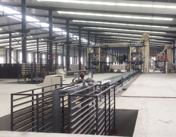 該設(shè)備主要由原料儲(chǔ)存?zhèn)}、電腦配料裝置、干粉混合機(jī)、輸送及提升系統(tǒng)、料漿混合系統(tǒng)、板材生產(chǎn)線、自動(dòng)工控系統(tǒng)等組成。