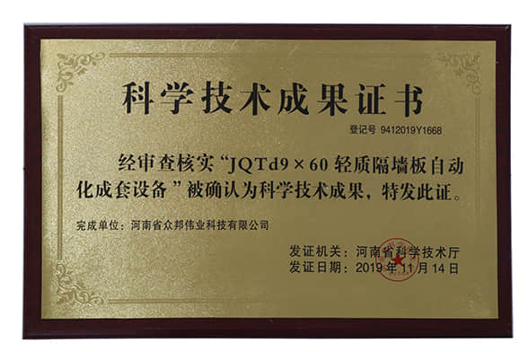 輕質(zhì)隔墻板自動化成套設(shè)備科學技術(shù)成果證書